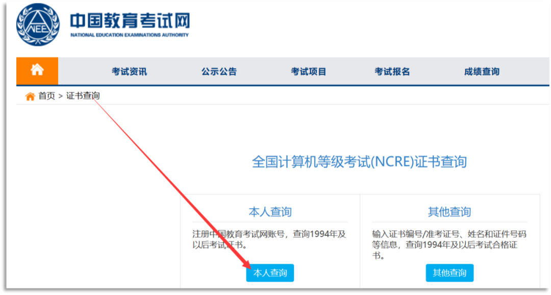 选择“考生服务”=>“证书查询”=>“本人查询”