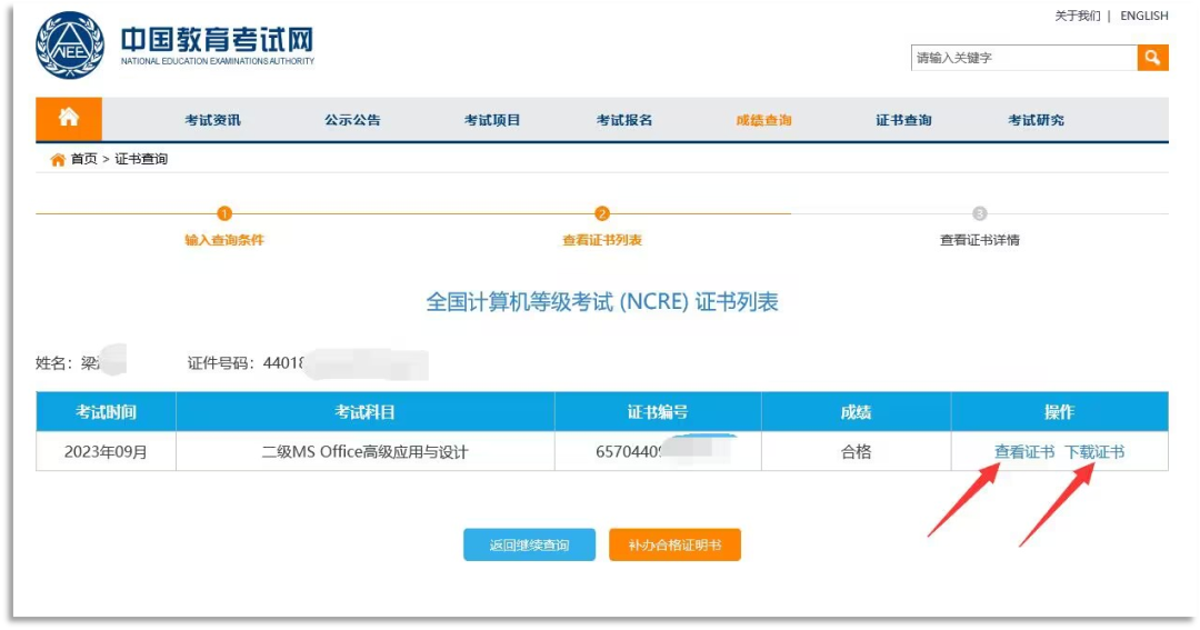 (考生可根据网站提示,自行注册“中国教育考试网账号”进行本人证书查询并下载合格证书电子版。)