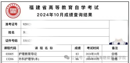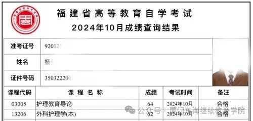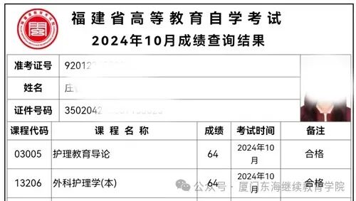 22级林英坪同学:2023年报读厦门医学院护理学衔接本科班,3月份注册衔接学籍,目前省考和校考科目已经全部通过,正准备明年申报论文答辩!