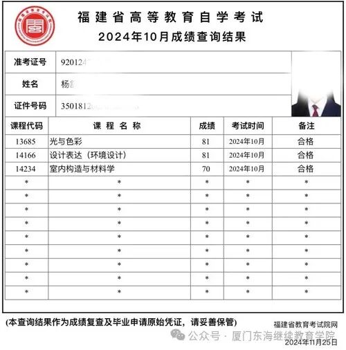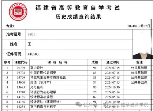 23级王乙寒同学:2024年报读长沙理工大学环境设计衔接本科班,3月份注册衔接学籍,4月份参加第一次省考,6月份参加第一次校考,10月份参加第二次省考,目前参加的考试科目有9门,其中校考4门全部合格,省考5门全部合格,目前还剩4门校考(12月份全部考完),预计明年可申报论文答辩,实现一年半毕业!