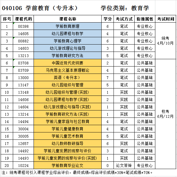 校考课程:每年6月、12月组织考试。由本科主考院校命题,简称“校考”,考点设置在本学校内,类似平时学校期末考试形式,100分考60分及格。在校生可加过程性考核平时分,即笔试卷面分达45分即可。