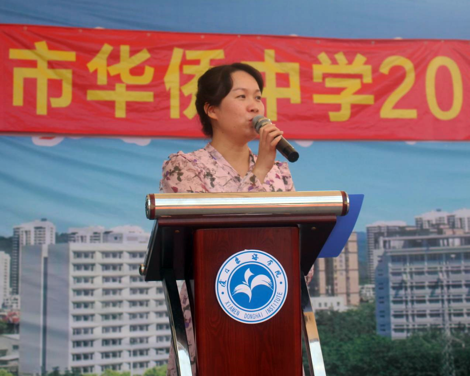 华侨中学副校长黄雅蓉做开营仪式动员讲话