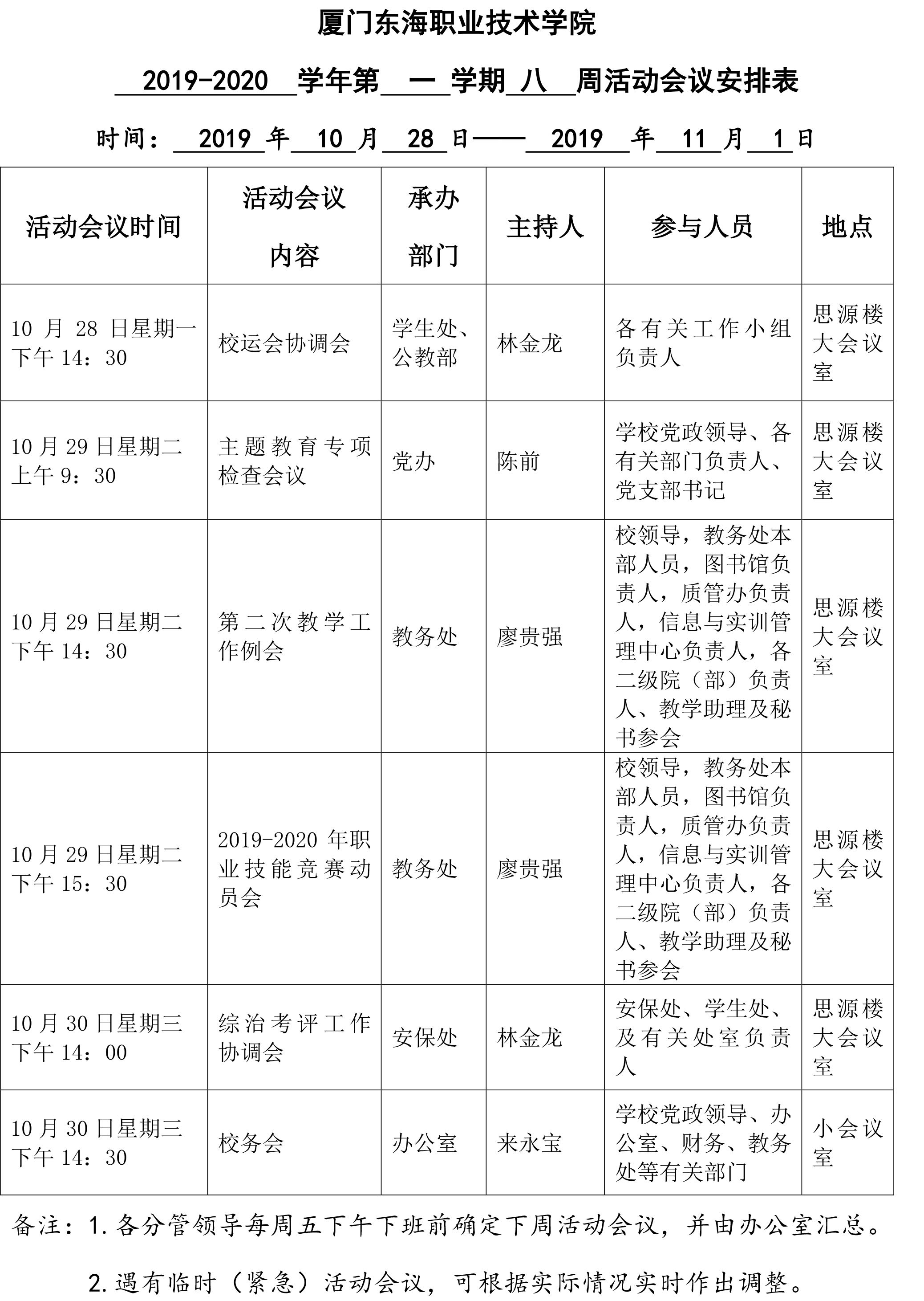 2019-2020学年第一学期八周活动会议安排表