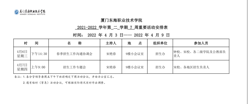 2021-2022学年第二学期第7周重要活动安排表