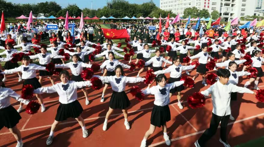 校运会方阵是面向全校师生展示教师教育学院学子们青春风采的重要舞台,历经半个月的排练准备,伴随着活泼的乐曲声奏响,随着融融秋日洒满绿茵,旋转,跳跃……青春的旋律奏响激情的鼓点,动感的节拍炫动着活力的舞步,牵起手围成的圈,象征着教师教育学院的团结友爱,齐心协力,奋勇向前。
