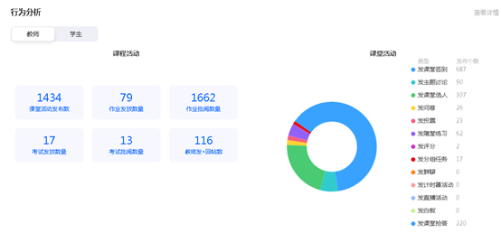 课堂活动数1434次,作业发放数量79次,作业批阅数量1662次,考试发放数量17次,教师发帖数116次。