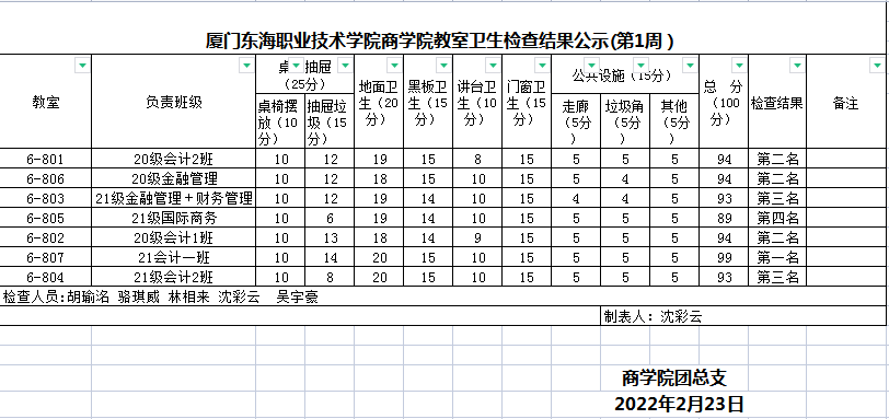 2021-2022年第二学期商学院第一周班级卫生评比