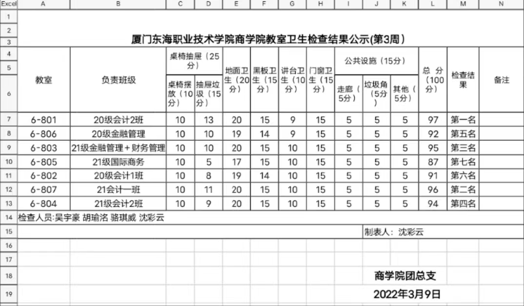 2021-2022年第二学期商学院第六周班级卫生评比