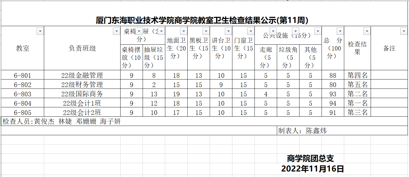 2022-2023学年第一学期商学院第十一周班级卫生评比